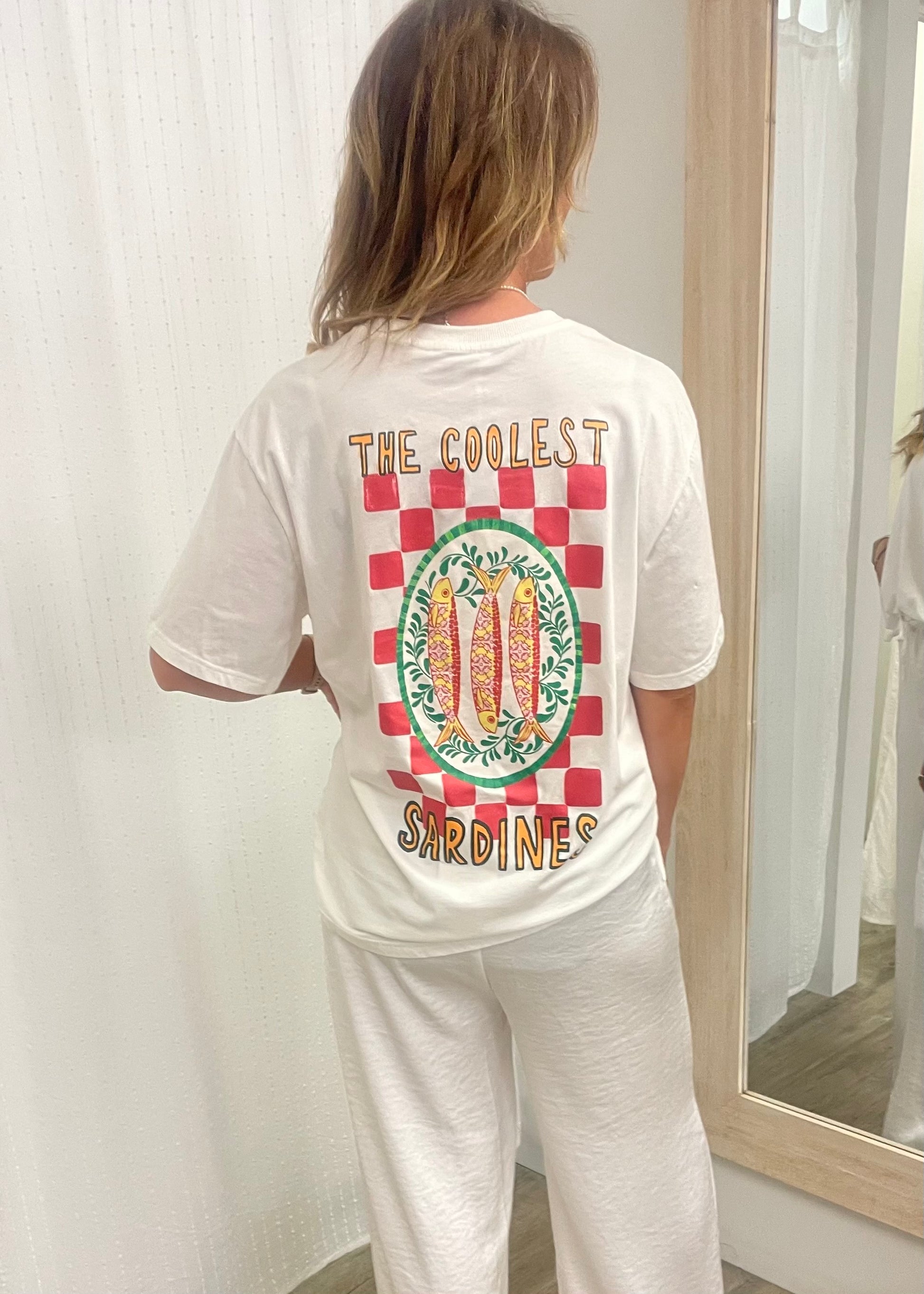 Dive into festive fun with the Hazel Tee, featuring a cheeky sardine print in vibrant Christmas colours. This relaxed-fit tee brings a quirky, lighthearted vibe to your seasonal wardrobe—perfect for those who love a bit of humour with their holiday style. Comfortable and casual, it's an instant conversation starter that celebrates the silly side of the season.