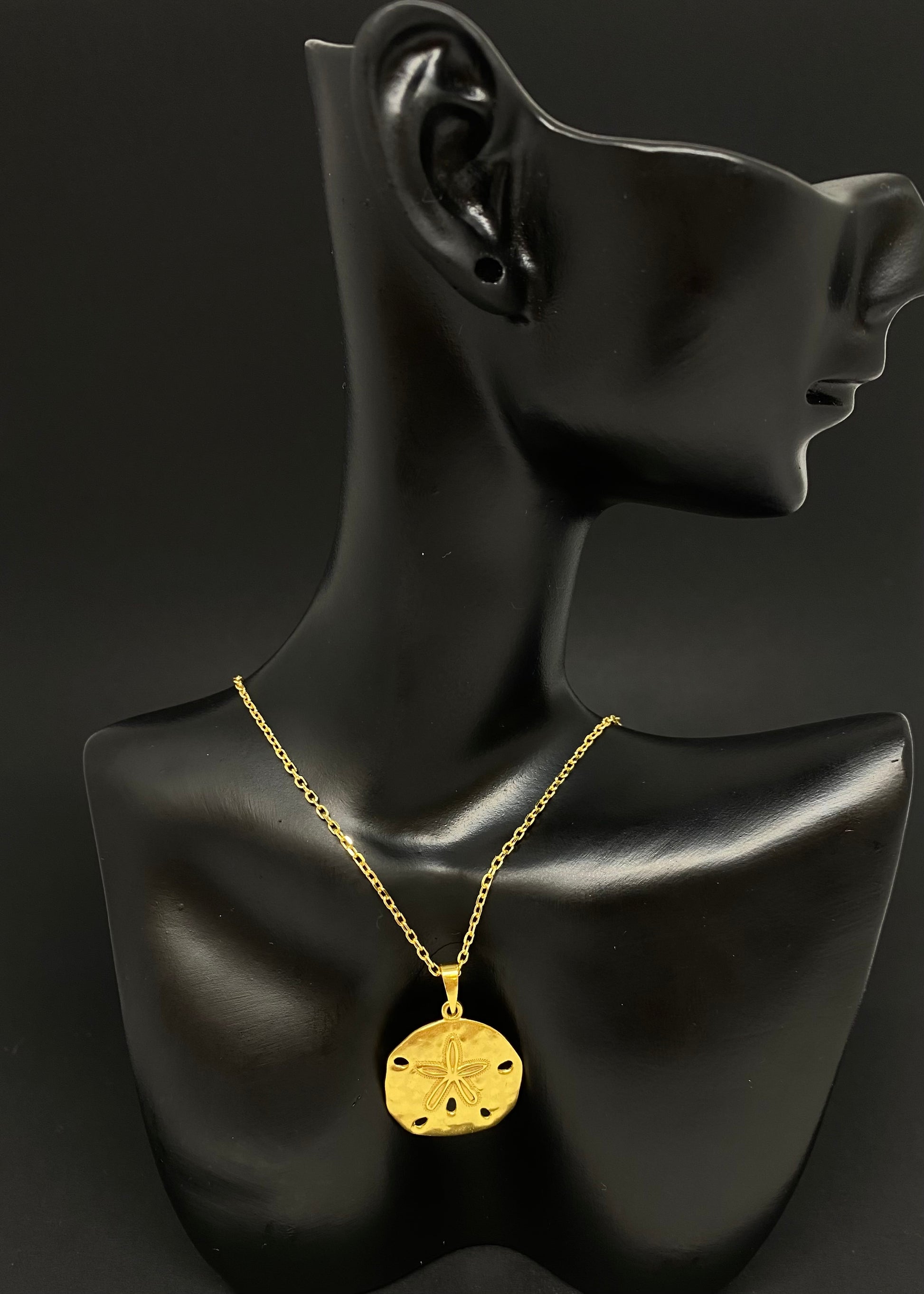 The Kailani Gold Sand Dollar Necklace blends refined craftsmanship with coastal charm. Featuring a delicately detailed sand dollar pendant in radiant gold, this necklace adds an elegant and subtle statement to your look. Ideal for enhancing both every day and special occasion outfits, it brings a touch of sophistication inspired by the serene beauty of the sea.