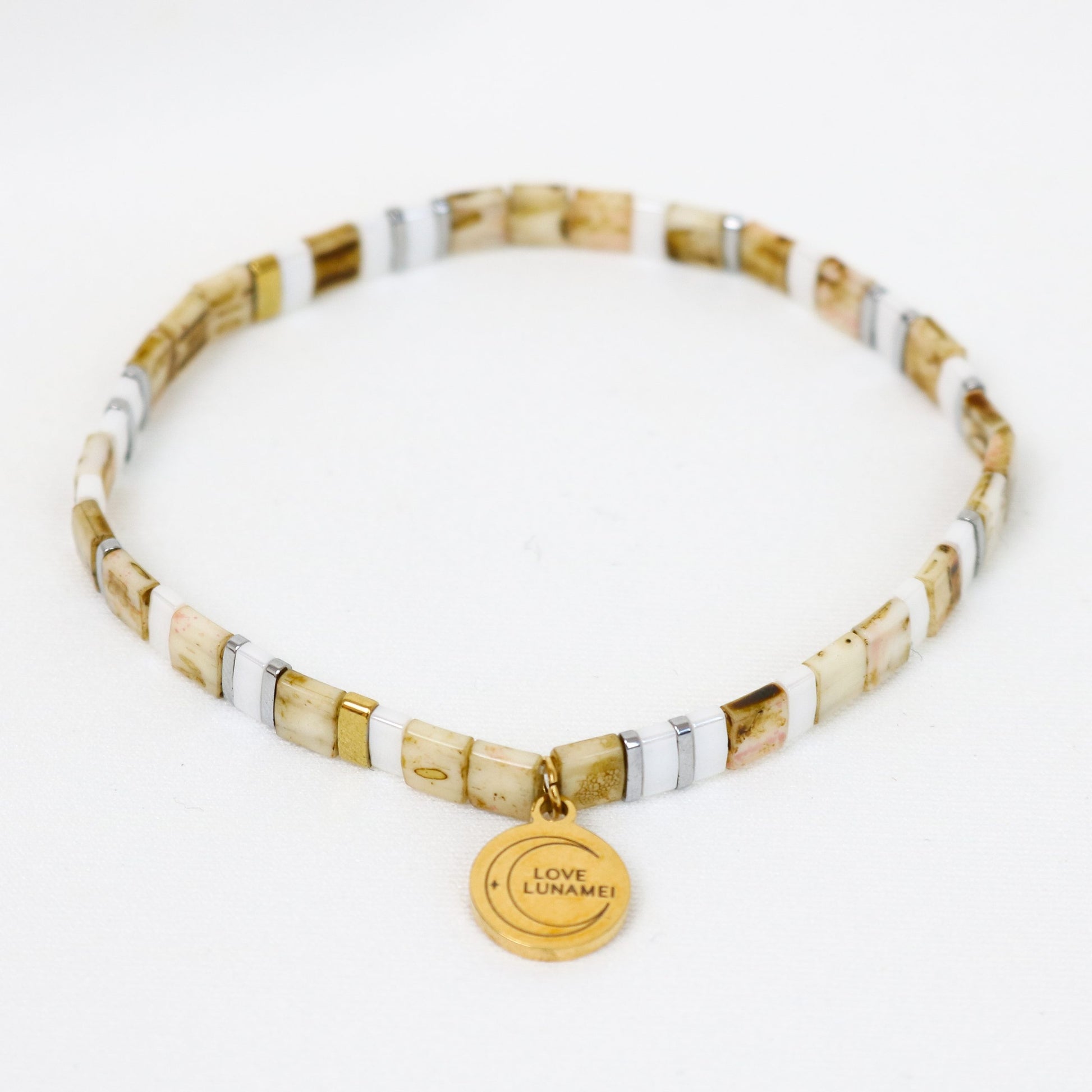 With durable double strand elastic and Japanese Glass beads our Love Bracelets are designed for stacking and layering. Finished with a Love Lunamei charm, wear them in a set or layer them.