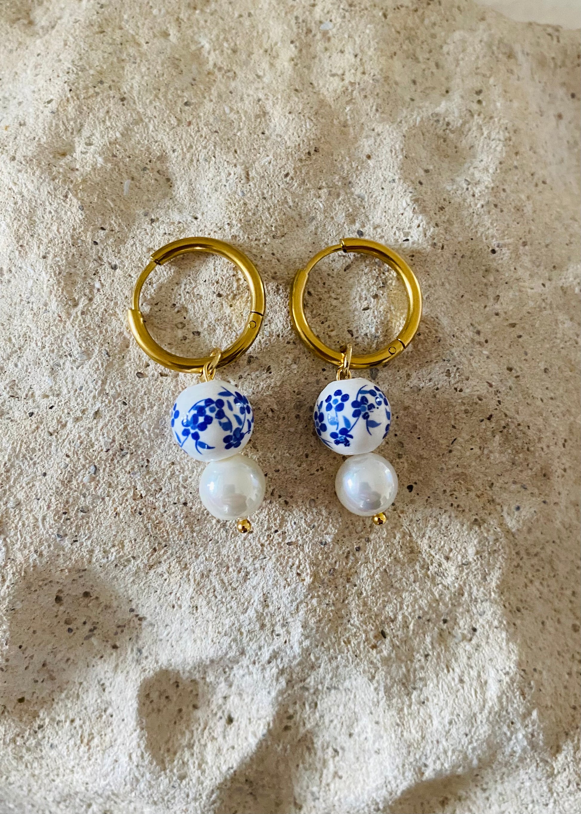 Elegant gold stainless steel hoops with hand painted blue floral ceramic beads. A timeless design blending modern simplicity with vintage inspired charm. Perfect for everyday wear or to elevate a classic look.